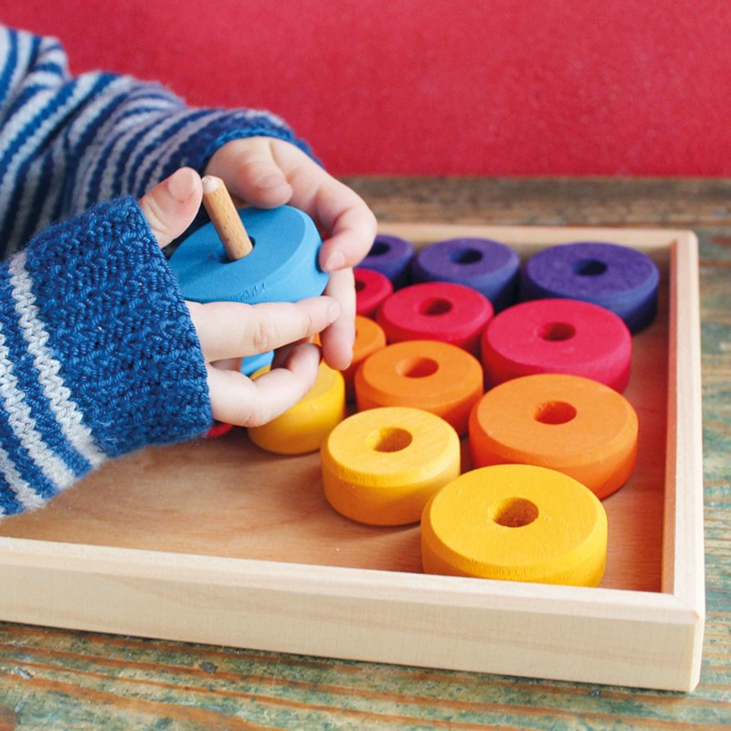 Petit jeu d'enfilage avec gros disques et épingle en bois adaptée pour petites mains.